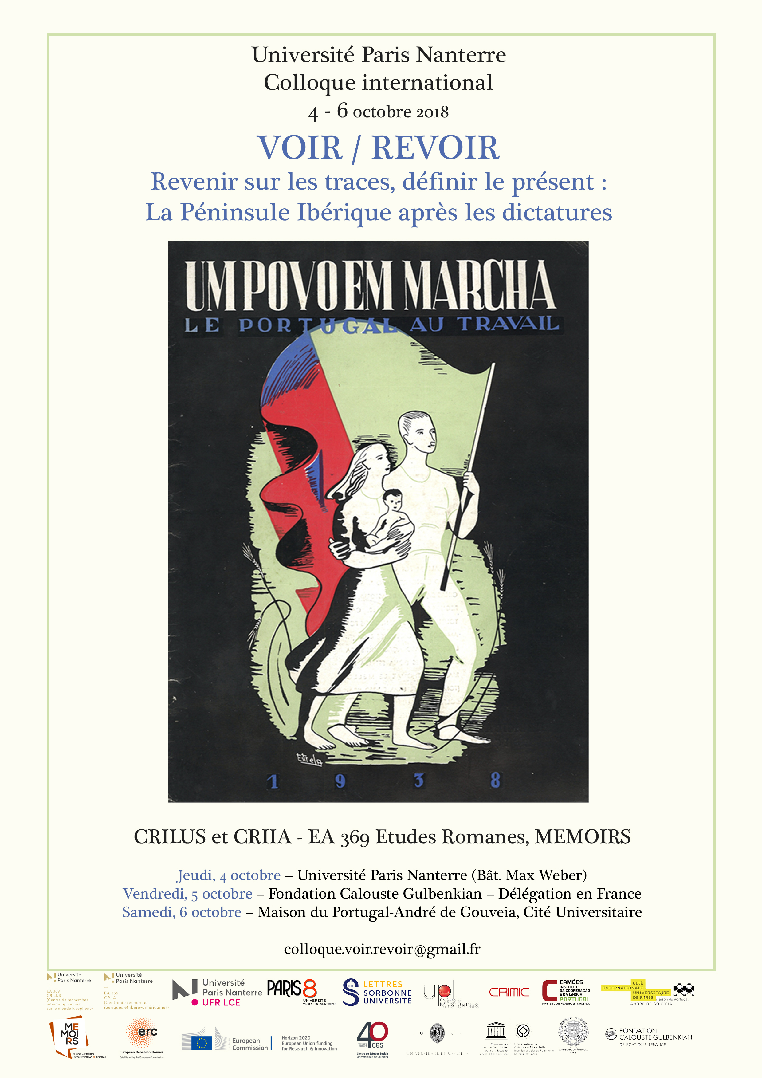 Colloque international organisé par le CRILUS (Centre de recherches interdisciplinaires sur le monde lusophone) et le CRIIA (Centre de recherches ibériques et ibéro américaines) de l'EA Études Romanes en partenariat avec MEMOIRS (CES Université de Coimbra, Portugal) et de nombreux partenaires. Il porte sur le thème : " VOIR / REVOIR : Revenir sur les traces, définir le présent : La Péninsule Ibérique après les dictatures "