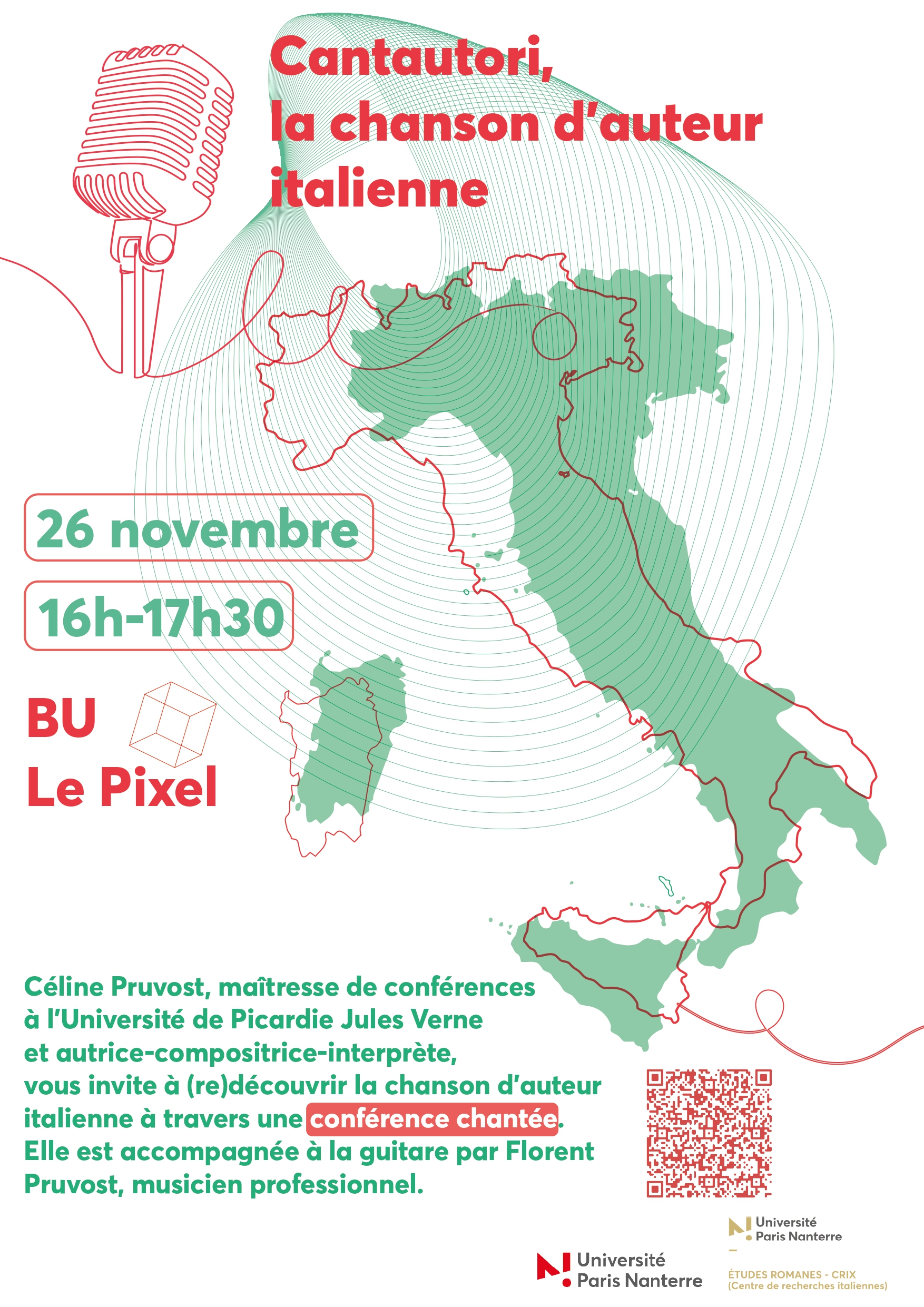Mélodies intemporelles, paroles avant-gardistes, grands succès populaires : les chansons des cantautori sont devenues le patrimoine affectif de plusieurs générations. À l'occasion de la sortie de son dernier livre ("Cantautori, la chanson d'auteur dans l'Italie des années 1960 et 1970", Université de Picardie Jules Verne), Céline Pruvost, maîtresse de conférences et autrice-compositrice-interprète, vous invite à (re)découvrir la chanson d’auteur italienne à travers une conférence chantée qui mêle analyse, récit et performance. Céline Pruvost est accompagnée à la guitare par Florent Pruvost, musicien professionnel.