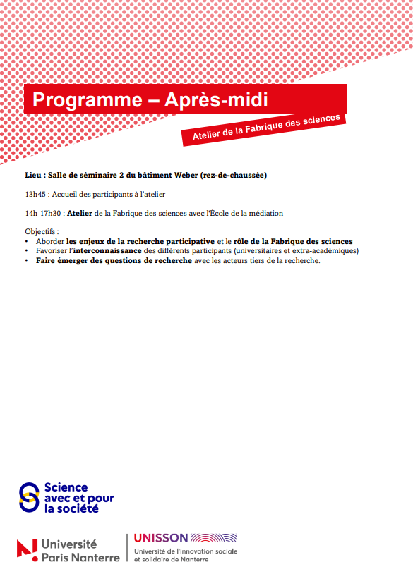 La matinée (9h-13h) se déroulera en deux temps: retours d’expérience sur des projets accompagnés par la politique Science Avec et Pour la Société (SAPS) de l’établissement, suivis d’une présentation de l’histoire et des enjeux de la Fabrique des sciences ainsi que des perspectives de ses actions dans le cadre de la politique SAPS.