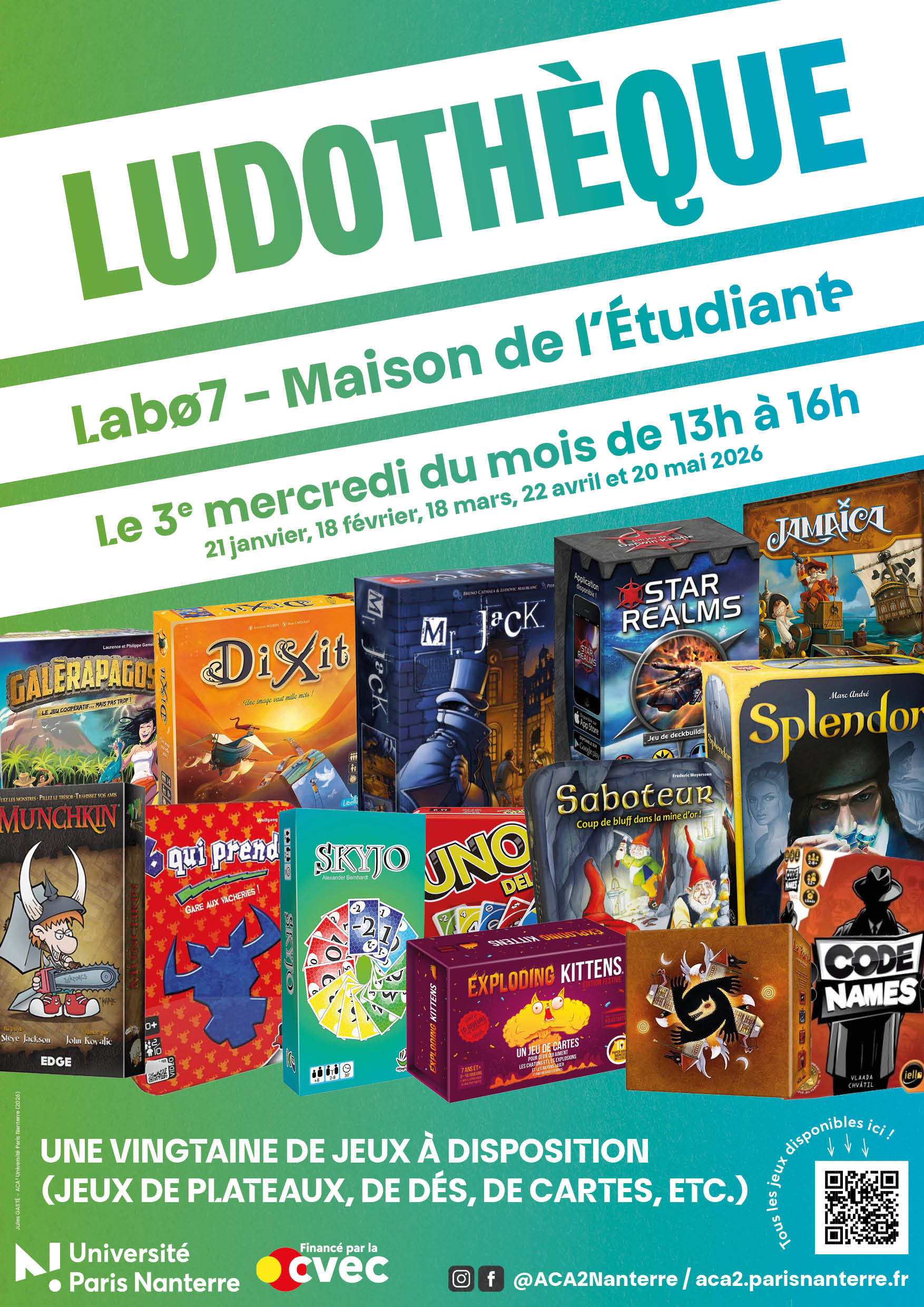 À partir de janvier 2026, la ludothèque de la Maison de l'Étudiant·e est désormais ouverte chaque 3e mercredi du mois, de 13h à 16h, au Labø7 !