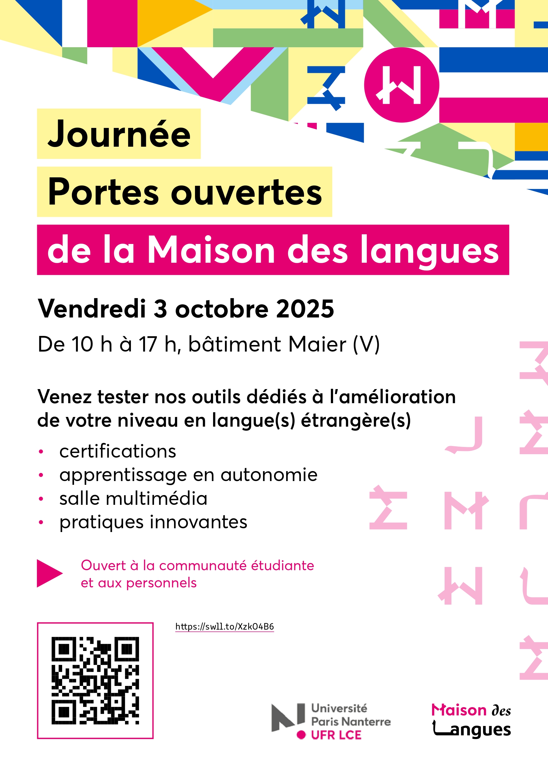 La Maison des langues fête sa rentrée ! Nous vous invitons à la Journée Portes Ouvertes de la Maison des Langues le vendredi 3 octobre 2025 de 10h à 17h dans l’Espace Odyssée (salle R02, bâtiment Ida Maier).