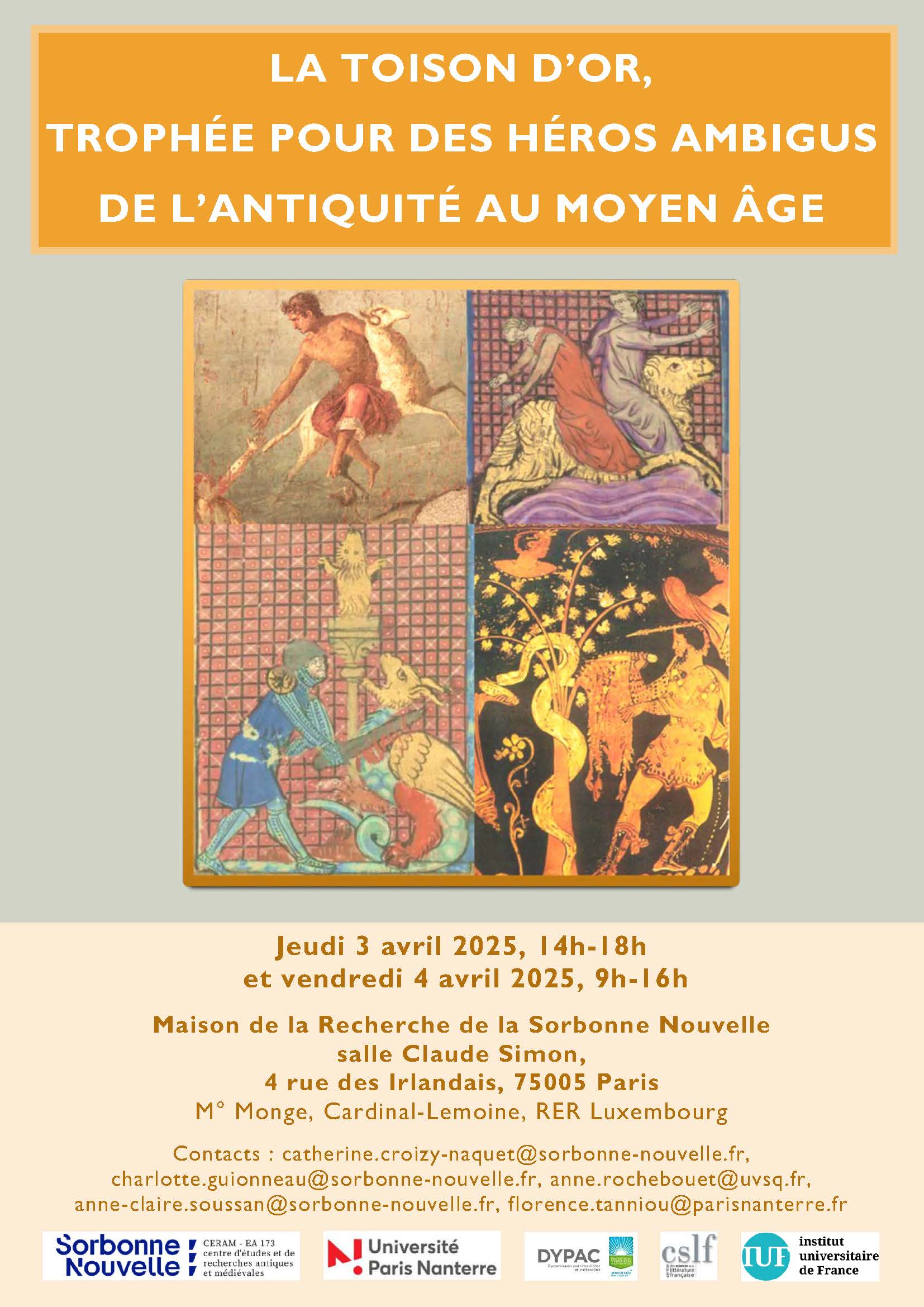 - « Jason et l’invention de la Toison d’or dans l’Histoire de Jason de Raoul Lefèvre », colloque La Toison d’or : un trophée pour héros ambigus (Antiquité-Moyen Âge), organisé par C. Croizy-Naquet, C. Guionneau, A. Rochebouet, A.-C. Soussan et F. Tanniou, Paris, 3-4 avril 2025